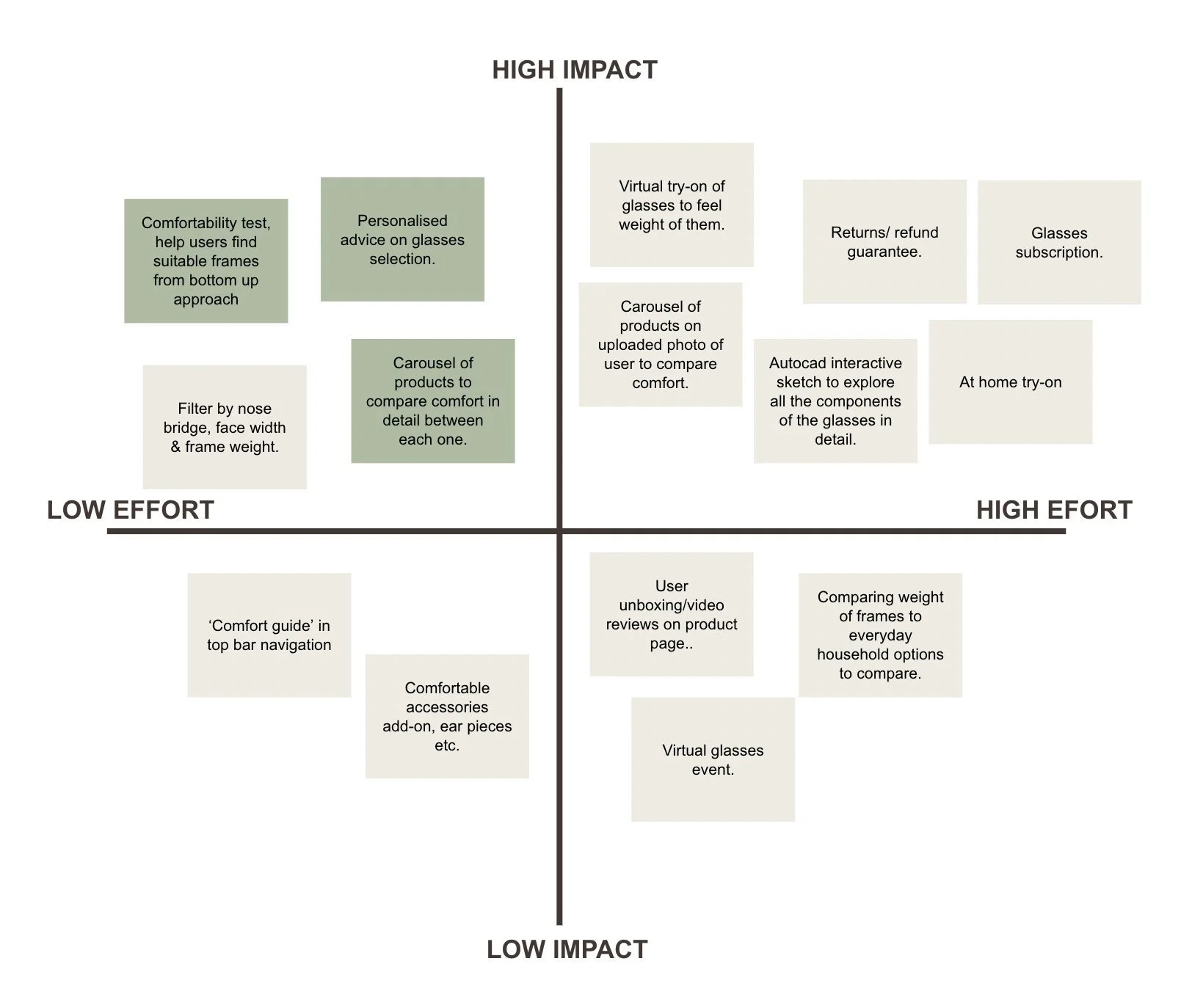 These choices prioritise a personalised experience, catering to Chantelle's comfort and listening to her needs. Additionally, this solution offers high impact with minimal effort, as evident in the Feature analysis below.